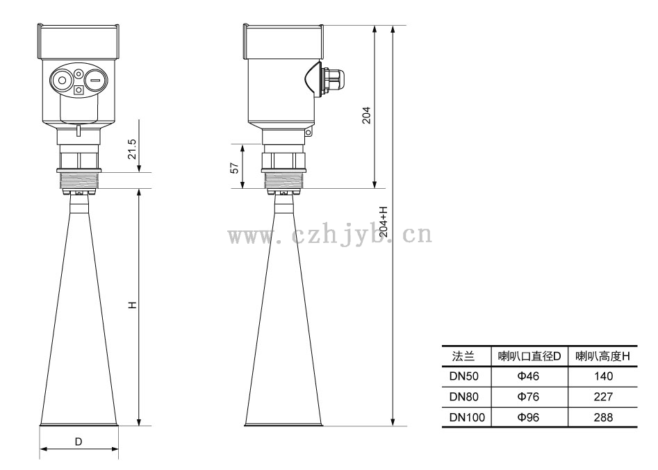 注:使用雷達(dá)物位計(jì)時(shí),務(wù)必保證最高料位不能進(jìn)入測量盲區(qū)(圖中D所示區(qū)域)。